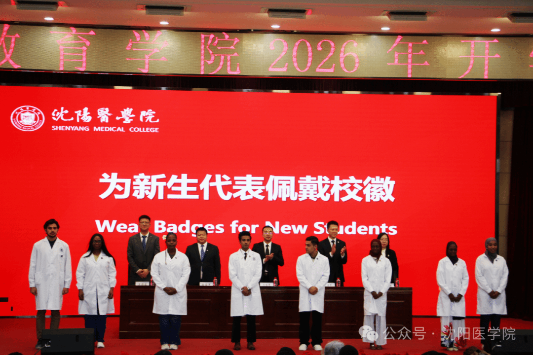 伴随着激昂悠扬的旋律,全体师生共同唱响沈阳医学院校歌,为本次开学典礼拉开序幕。随后,学校领导与国际教育学院负责同志为新生代表佩戴校徽,标志着新生们正式肩负起医学使命,踏上守护生命的征程。随后,全体新生肃立,举起右拳,庄严宣读医学生誓言,“健康所系,性命相托”的铮铮誓言在会场久久回荡,深刻诠释了新一代医学生守护生命、践行使命的坚定信念与责任担当。